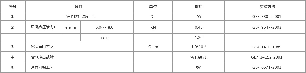PVC-C樹脂為母料,該產(chǎn)品具有強度高、柔韌性好、耐高溫、耐腐蝕、阻燃、絕綠性能良好、不易老化、質(zhì)輕、施工方便等特點,其各項性能指標(biāo)經(jīng)國家級、省檢測、鑒定和認(rèn)證,均已達(dá)到或超過國內(nèi)的同類產(chǎn)品水平。產(chǎn)品性能大優(yōu)于傳統(tǒng)的石棉電纜排管及普通PVC管材,是傳統(tǒng)電力電纜護套管的理想替代品。
